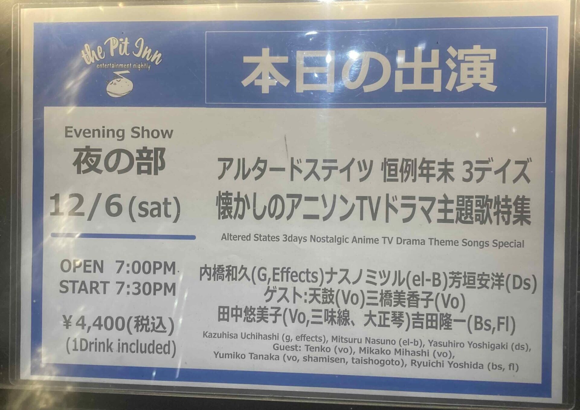そのバンドが、日本のジャズを育てた老舗ジャズ・ライブハウス「新宿PIT INN」で毎年恒例の3daysの公演をやったのですが、その3日目がなんと「懐かしのアニソン・TVドラマ主題歌特集」!これはどう考えても見逃せない…。