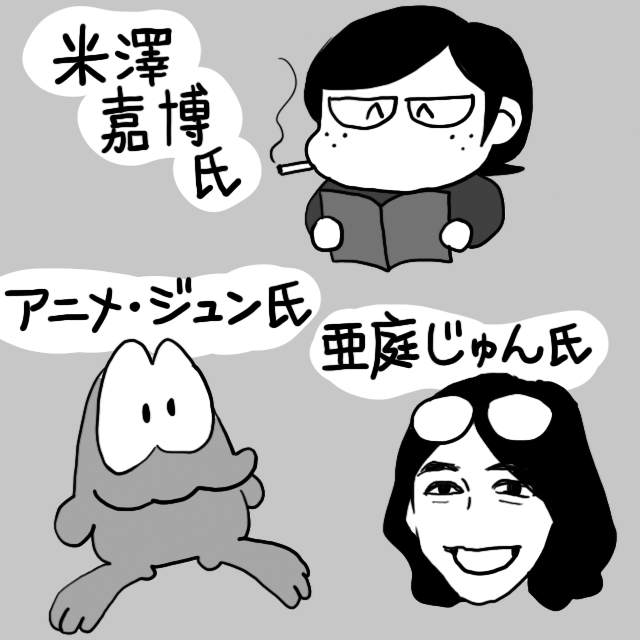 彼はコミックマーケットの創始者の1人なんですよ。アニメ・ジュン(霜月たかなか)と米澤嘉博[90]って漫画評論家と、亜庭じゅん[91]っていう評論家・ライター、この3人でコミックマーケットを立ち上げたんです。
