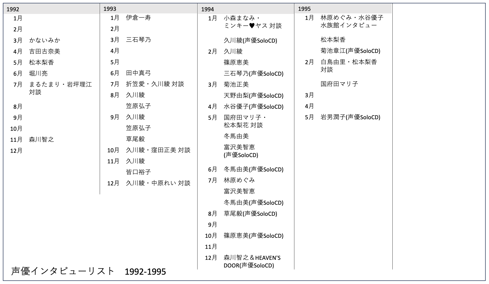 [141] 連続インタビュー : 93年7月号より8ヶ月連続で1-2ページのインタビューがあり「いつの間にかシリーズ化していた久川綾INTERVIEW」と記載されている('93年9月号)。また’94年3月号から'95年5月号(休刊号)までは毎号なにかしらの小さい記事を掲載。