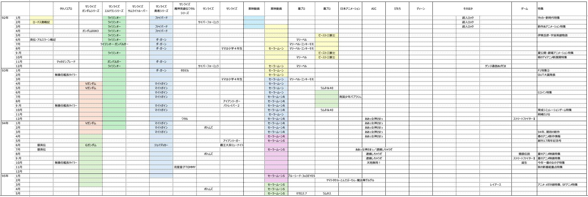 OUTは背表紙を見た方がいろいろ変遷がわかるんじゃないか、というので、背表紙に載っている作品タイトルをずらっと並べてみたら、やっぱり制作会社で分けたくなっちゃって。それがこのリストなんですが、やっぱりサンライズ[93]がすごく多いんですよ。